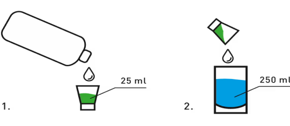 1-2 x täglich 25 ml Chlorophyll-Konzentrat mit ca. 250 ml stillem Wasser auffüllen.